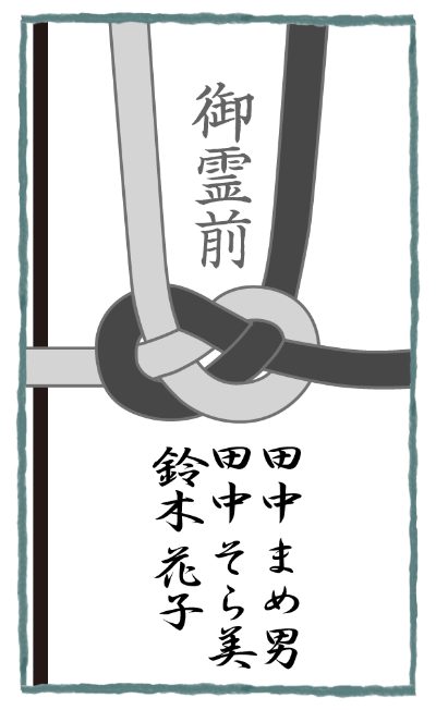 何人かで一緒に香典を包むときは、一番右に目上の方(上司・先輩)などの名前を書きます。