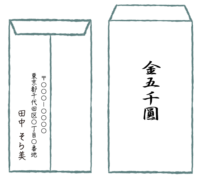 中袋は、すべて共通です。表に金額を入れます。裏には住所と名前を書きます。表の金額は、漢数字で書くのが基本です。画像は大字という難しい字を使っていますが、普通の漢数字で書いてもかまいません。